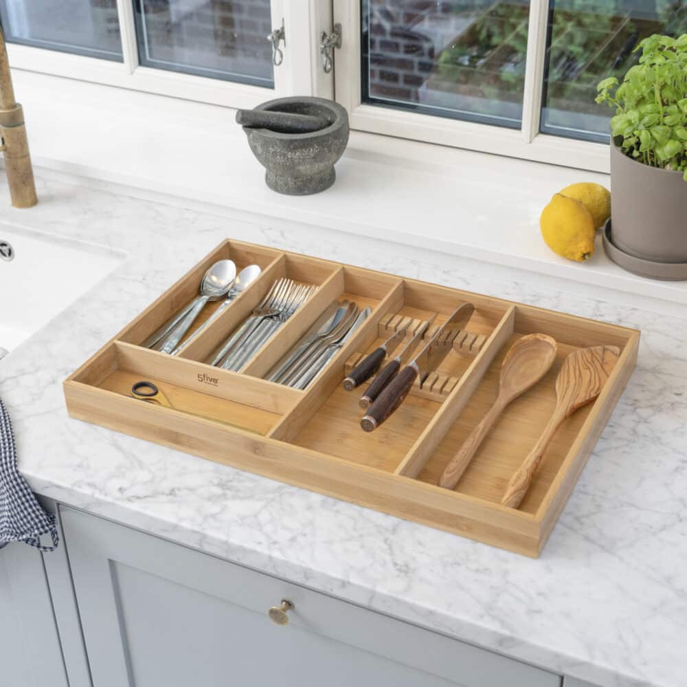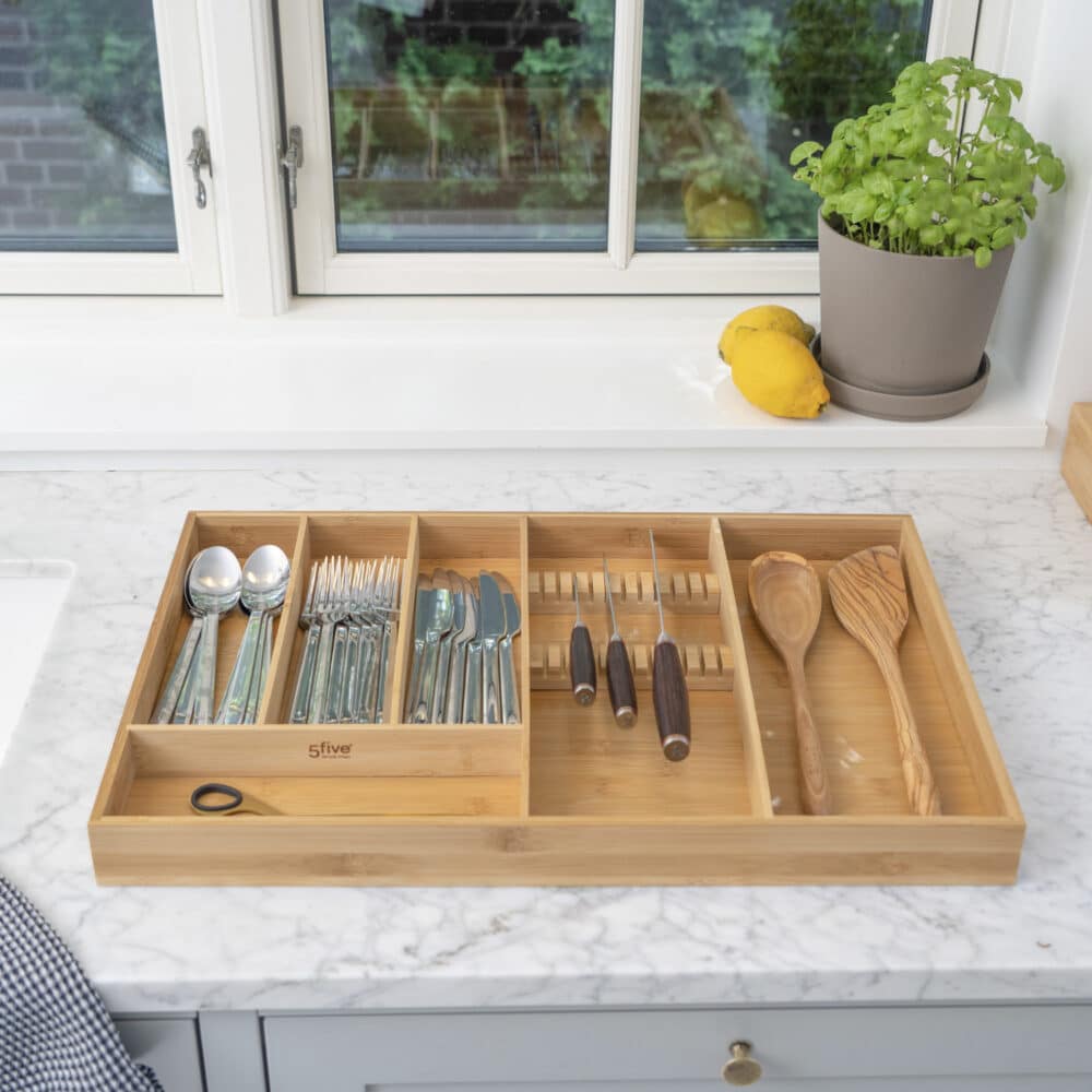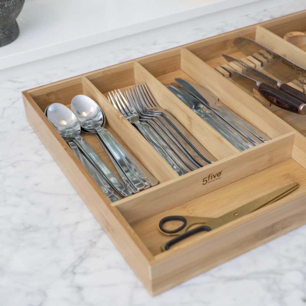 Organisez vos tiroirs de cuisine avec ce range-couverts 3 compartiments en bambou.